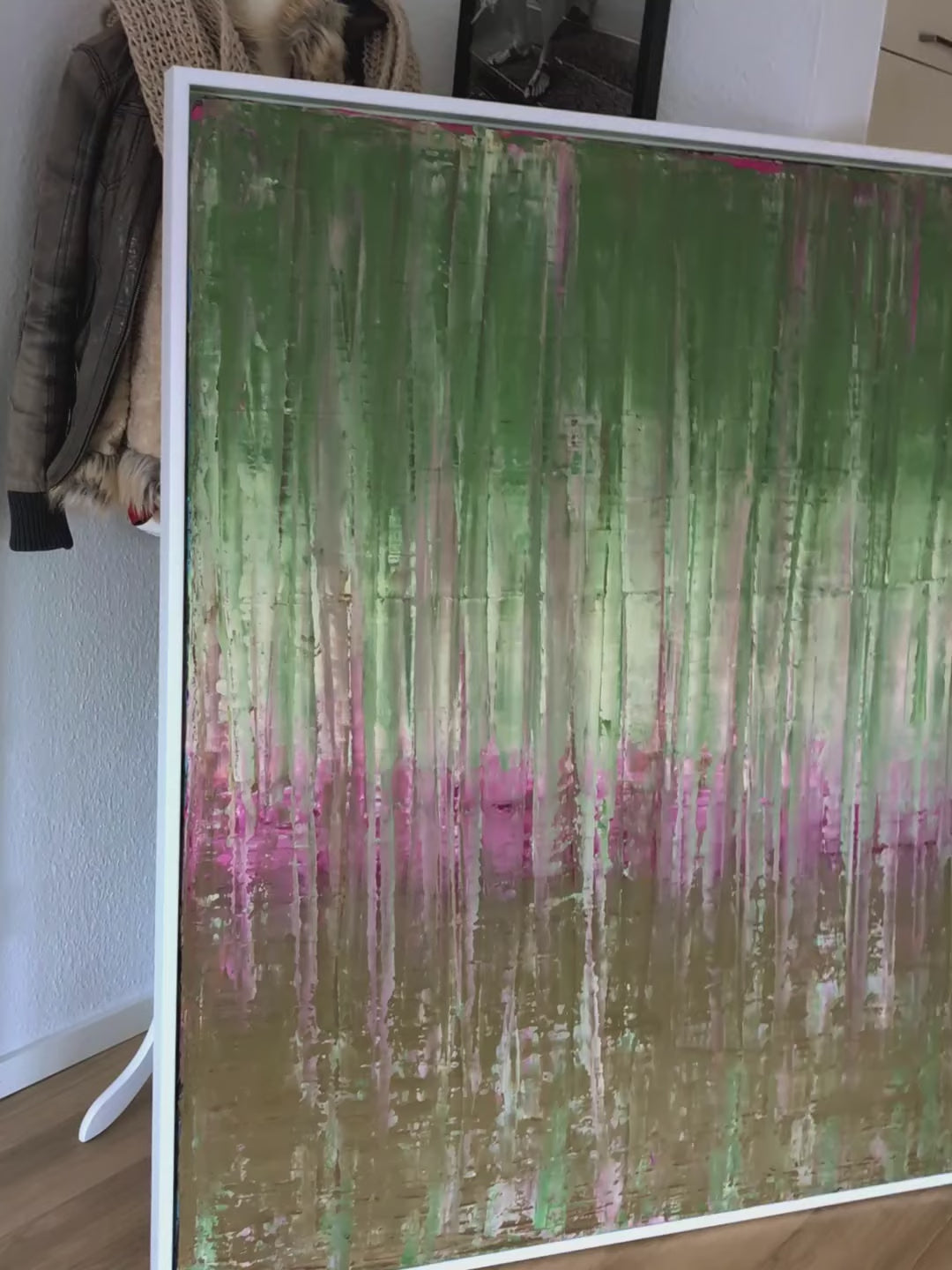Das Ergebnis ist eine Arbeit, die Tiefe, Bewegung und Dankbarkeit ausstrahlt. Inspiriert von der Technik eines Gerhard Richter, jedoch in einer ganz eigenen, organischen Sprache.